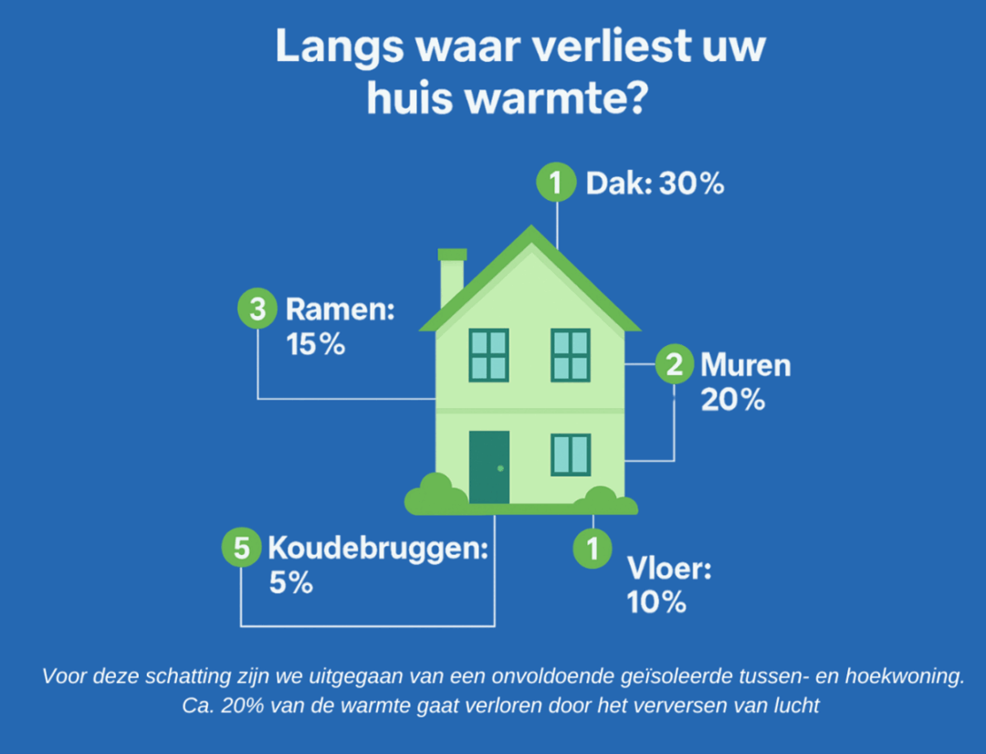 Dat hangt af van uw situatie, maar wist u dat warme lucht opstijgt en daarom altijd naar het hoogste punt van het huis gaat? Tot zo’n 30% van de warmte gaat verloren via het dak, gevolgd door de gevels (20%), de ramen (15%) en de vloer (10%). Het meest logisch is dus om eerst de bouwdelen aan te pakken via waar u de meeste warmte verliest. Grote kans dat dat uw dak of zolder is, maar het kan ook uw spouwmuur of glas zijn. Weet u niet waar u moet beginnen? Via het Zeeuws Isolatieprogramma kunt u gratis isolatieadvies aanvragen. Een isolatieadviseur komt bij u langs en maakt een advies op maat.